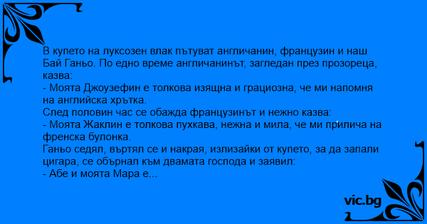 В купето на луксозен влак пътуват англичанин, французин и наш Бай Ганьо. По едно време англичанинът, загледан през прозореца, казва: