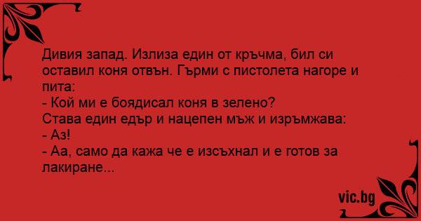 Μια μέρα, ένας καουμπόη, μπαίνει νευριασμένος σ` ένα σαλούν και φωνάζει: - "Ποιος έβαψε το άλογό μου πράσινο;" Δεν παίρνει απάντηση, και ξαναρωτάει: - "Ποιος έβαψε το άλογό μου πράσινο;" Σηκώνεται...