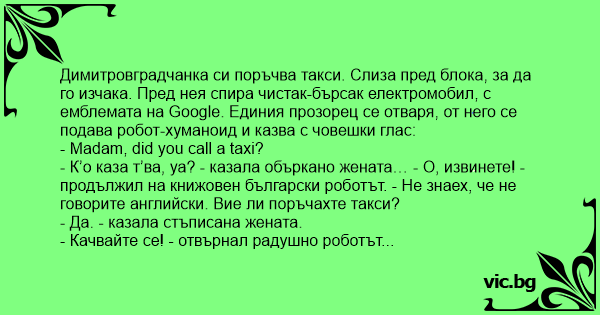 - К’о каза т’ва, уа? - казала объркано жената… - О, извинете! - продължил на книжовен български роботът. - Не знаех, че не говорите английски. Вие ли поръчахте такси?