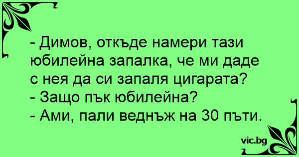 - Димов, откъде намери тази юбилейна запалка, че ми даде с нея да си запаля цигарата?