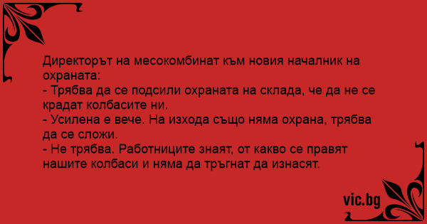 - Трябва да се подсили охраната на склада, че да не се крадат колбасите ни.