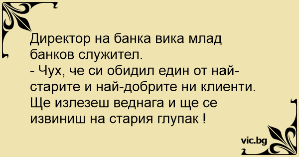 Bankdirektør Svendsen kaldte den unge bankassistent til sig. - Jeg hører, De har fornærmet en af vores allerældste og bedste kunder. Vil De øjeblikkelig gå ud og give den gamle nar en undskyldning…