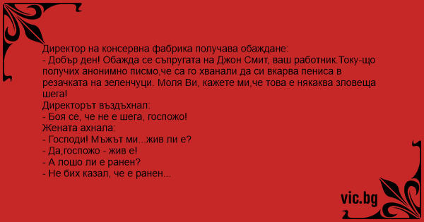 - Добър ден! Обажда се съпругата на Джон Смит, ваш работник.Току-що получих анонимно писмо,че са го хванали да си вкарва пeниca в резачката на зеленчуци. Моля Ви, кажете ми,че това е някаква зловеща шега!