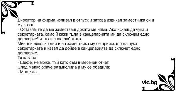 - Оставям те да ме заместваш докато ме няма. Ако искаш да чуkaш секретарката, само й кажи "Ела в канцеларията ми да сключим едно договорче" и тя си знае работата.
