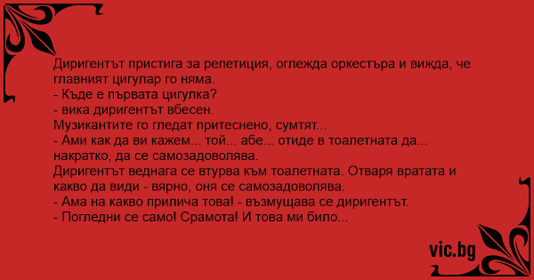 Диригентът веднага се втурва към тоалетната. Отваря вратата и какво да види - вярно, оня се самозадоволява.