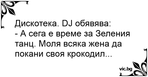 - А сега е време за Зеления танц. Моля всяка жена да покани своя крокодил...