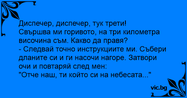 Самолет, разполагащ със най-модерните системи, лети на автопилот над Атлантика. Изведнъж силна аларма събужда заспалия пилот, който слава богу, реагира светкавично и дава гласова команда на бордовия компютър: