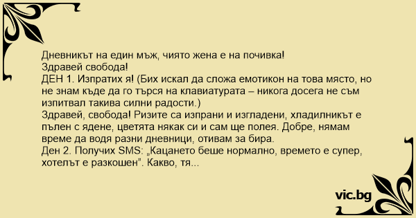 Ден 12. Излязох от работа (колегите се натъжиха много, когато разбраха по какъв повод), посрещнах половинката, закарах я вкъщи. Една такава загоряла, бодра. Веднага се зае с домакинството. Включи съдомиялната, пералнята. Отвори хладилника, учуди се: Защо не си ял супа? Цялата тенджера си стои. А аз откъде да знам какво има в тази тенджера? От бирата въобще не я виждах. След това в банята: о, не си ли виждал грeбена ми във форма на папагал? Видя „Оргии на плътта”, веднага се развесели: мъчно ти беше, нали? На вратата се звъни. Съседката отдясно, старата вещица: о, колко е хубаво, че се върнахте, на мъжа ви му беше толкова мъчно, толкова мъчно
