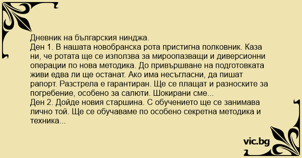 Ден 2. Дойде новия старшина. С обучението ще се занимава лично той. Ще се обучаваме по особено секретна методика и техника "болгарнинджа", за която и преподаващите нищо не знаят. Строго секретно. За демонстрация старшината уви около палеца си три метра бодлива тел. После изяде каската на ефрейтор Душегубов. Пак изпаднахме в шок.