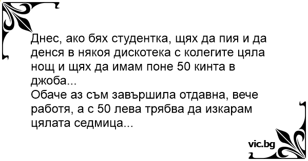 Обаче аз съм завършила отдавна, вече работя, а с 50 лева трябва да изкарам цялата седмица...