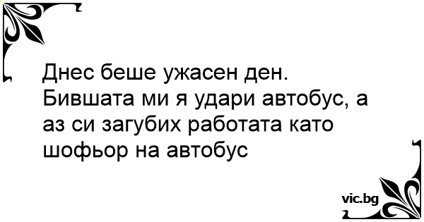 Днес беше ужасен ден. Бившата ми я удари автобус, а аз си загубих работата като шофьор на автобус