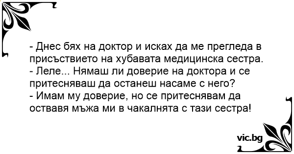 - Днес бях на доктор и исках да ме прегледа в присъствието на хубавата медицинска сестра.