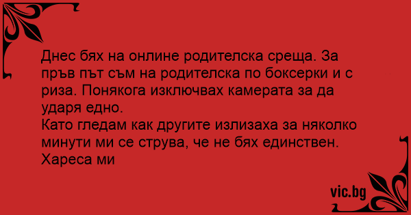 Днес бях на онлине родителска среща. За пръв път съм на родителска по боксерки и с риза. Понякога изключвах камерата за да ударя едно.