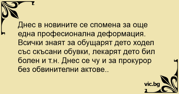 Днес в новините се спомена за още една професионална деформация. Всички знаят за обущарят дето ходел със скъсани обувки, лекарят дето бил болен и т.н. Днес се чу и за прокурор без обвинителни актове..