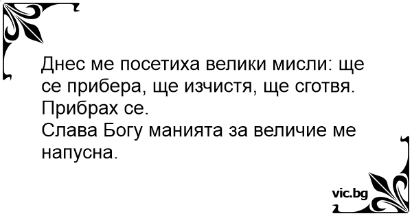 Днес ме посетиха велики мисли: ще се прибера, ще изчистя, ще сготвя.