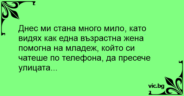 Днес ми стана много мило, като видях как една възрастна жена помогна на младеж, който си чатеше по телефона, да пресече улицата...