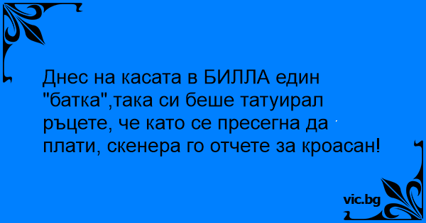 Днес на касата в БИЛЛА един "батка",така си беше татуирал ръцете, че като се пресегна да плати, скенера го отчете за кроасан!