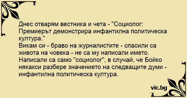 Викам си - браво на журналистите - спасили са живота на човека - не са му написали името. Написали са само "социолог", в случай, че Бойко някакси разбере значението на следващите думи - инфантилна политическа култура.