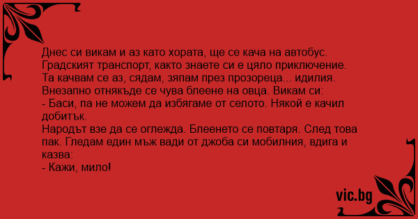 Та качвам се аз, сядам, зяпам през прозореца... идилия. Внезапно отнякъде се чува блеене на овца. Викам си: