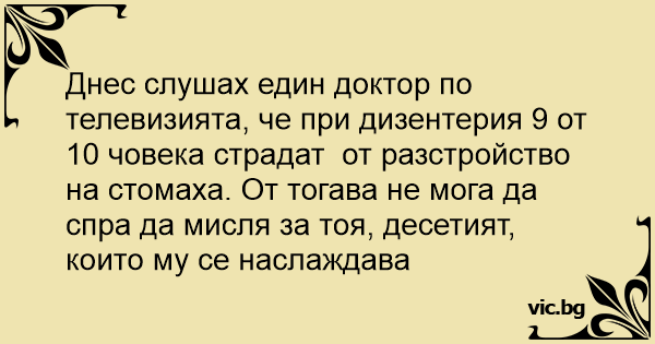 Днес слушах един доктор по телевизията, че при дизентерия 9 от 10 човека страдат от разстройство на стомаха. От тогава не мога да спра да мисля за тоя, десетият, които му се наслаждава