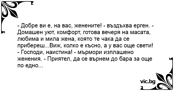 - Господи, наистина! - мърмори изплашено женения. - Приятел, да се върнем до бара за още по едно...