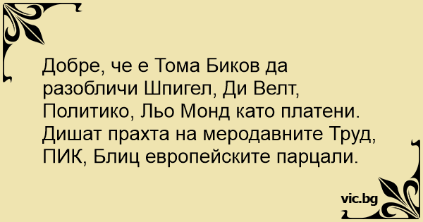 Добре, че е Тома Биков да разобличи Шпигел, Ди Велт, Политико, Льо Монд като платени. Дишат прахта на меродавните Труд, ПИК, Блиц европейските парцали.
