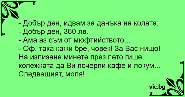 - Оф, така кажи бре, човек! За Вас нищо! На излизане минете през пето гише, колежката да Ви почерпи кафе и локум... Следващият, моля!