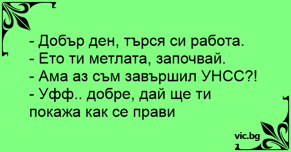 Шеф каже новому співробітнику: - Для початку підметіть в офісі підлогу! - Сер! Я закінчив Кембридж! - Обурюється той. - Ось воно що! Тоді дайте мені віник, та я покажу, як це робиться!