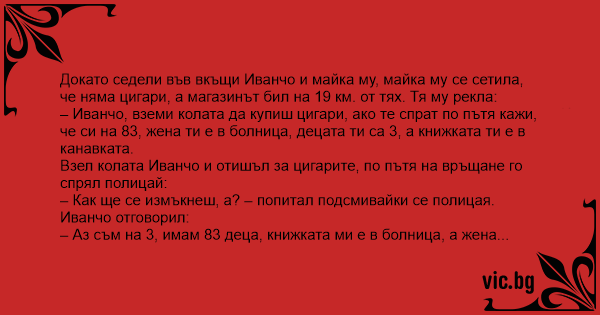 – Иванчо, вземи колата да купиш цигари, ако те спрат по пътя кажи, че си на 83, жена ти е в болница, децата ти са 3, а книжката ти е в канавката.