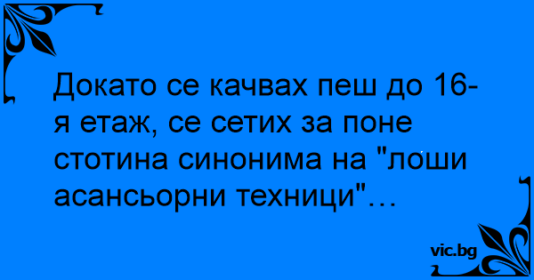 Докато се качвах пеш до 16-я етаж, се сетих за поне стотина синонима на "лоши асансьорни техници"…