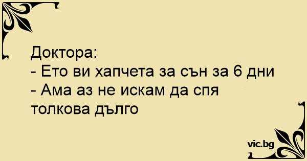 Ārsts-pacientam: - Šeit jums būs miegazāles sešām dienām. - Bet es negribu gulēt tik ilgi.