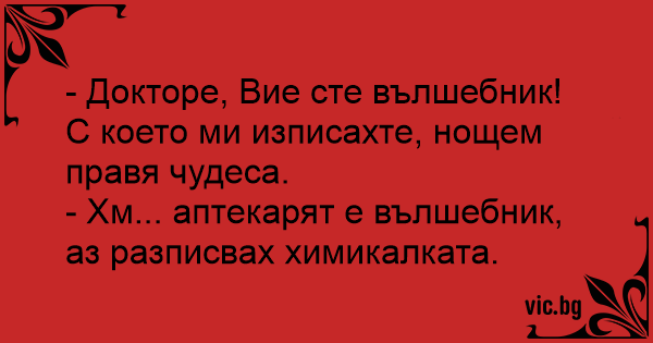 - Докторе, Вие сте вълшебник! С което ми изписахте, нощем правя чудеса.