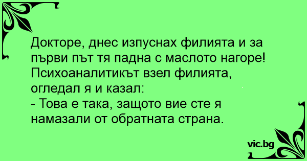 Докторе, днес изпуснах филията и за първи път тя падна с маслото нагоре!