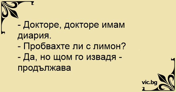 Un uomo dal dottore: "Dottore, Dottore, ho un grosso problema, non riesco a fermare la diarrea!" e il dottore: "Ha provato con il limone?" e l'uomo prontamente risponde: "Si, certo dottore, ma quando lo tolgo ricomincia come prima!"