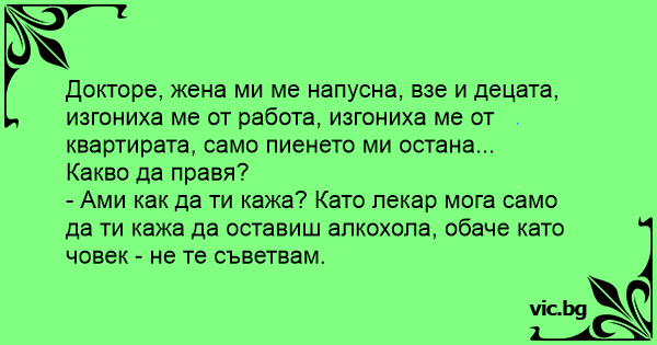 Докторе, жена ми ме напусна, взе и децата, изгониха ме от работа, изгониха ме от квартирата, само пиенето ми остана...