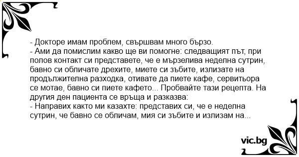 - Ами да помислим какво ще ви помогне: следващият път, при полов контакт си представете, че е мързелива неделна сутрин, бавно си обличате дрехите, миете си зъбите, излизате на продължителна разходка, отивате да пиете кафе, сервитьора се мотае, бавно си пиете кафето... Пробвайте тази рецепта. На другия ден пациента се връща и разказва:
