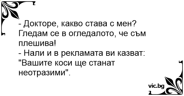 - Докторе, какво става с мен? Гледам се в огледалото, че съм плешива!
