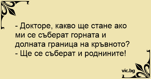 - Докторе, какво ще стане ако ми се съберат горната и долната граница на кръвното?