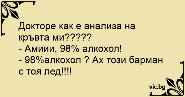 Докторе как е анализа на кръвта ми?????<br />- Амиии, 98% алкохол!<br />- 98%алкохол ? Ах този барман с тоя лед!!!!