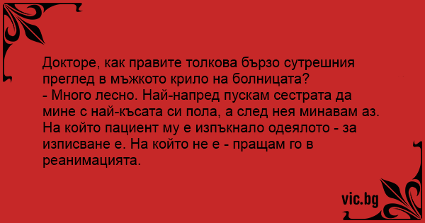 Докторе, как правите толкова бързо сутрешния преглед в мъжкото крило на болницата?