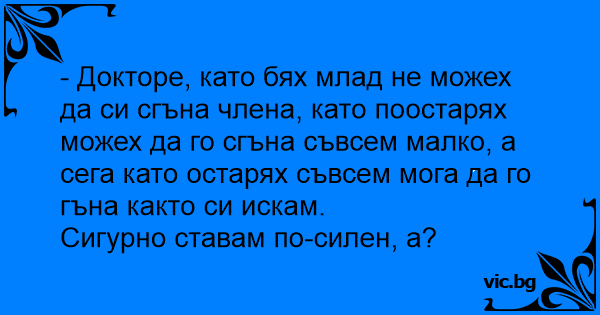 - Докторе, като бях млад не можех да си сгъна члeнa, като поостарях можех да го сгъна съвсем малко, а сега като остарях съвсем мога да го гъна както си искам.