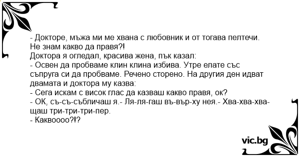 - Освен да пробваме клин клина избива. Утре елате със съпруга си да пробваме. Речено сторено. На другия ден идват двамата и доктора му казва: