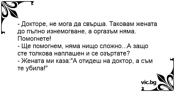 - Докторе, не мога да свърша. Таковам жената до пълно изнемогване, а opгaзъm няма. Помогнете!
