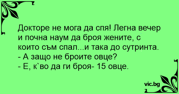 Докторе не мога да спя! Легна вечер и почна наум да броя жените, с които съм спал...и така до сутринта.