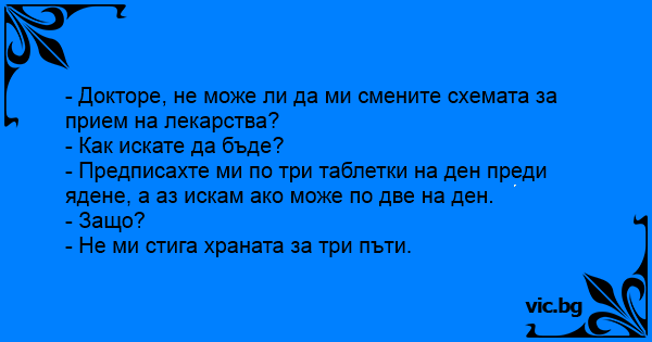 - Докторе, не може ли да ми смените схемата за прием на лекарства?