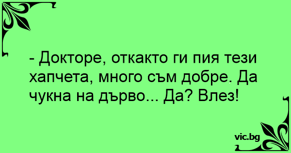 - Докторе, откакто ги пия тези хапчета, много съм добре. Да чукна на дърво... Да? Влез!