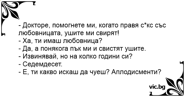 - Daktare, aš po sekso girdžiu ausyse švilpimą, ar galit man padėt? - Kiek jums metų? - Greit septyniasdešimt. - Atleiskit, bet tai natūralu, būtų keista, jei girdėtumėte aplodismentus…