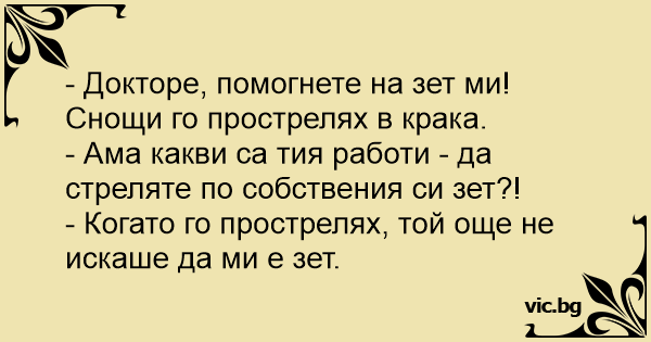 - Докторе, помогнете на зет ми! Снощи го прострелях в крака.