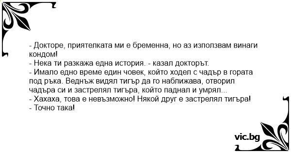 - Имало едно време един човек, който ходел с чадър в гората под ръка. Веднъж видял тигър да го наближава, отворил чадъра си и застрелял тигъра, който паднал и умрял...