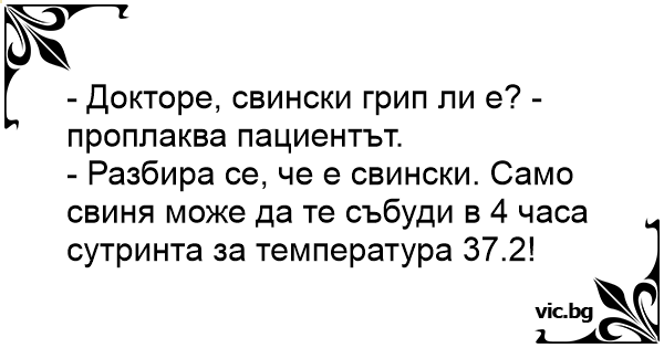 - Докторе, свински грип ли е? - проплаква пациентът.